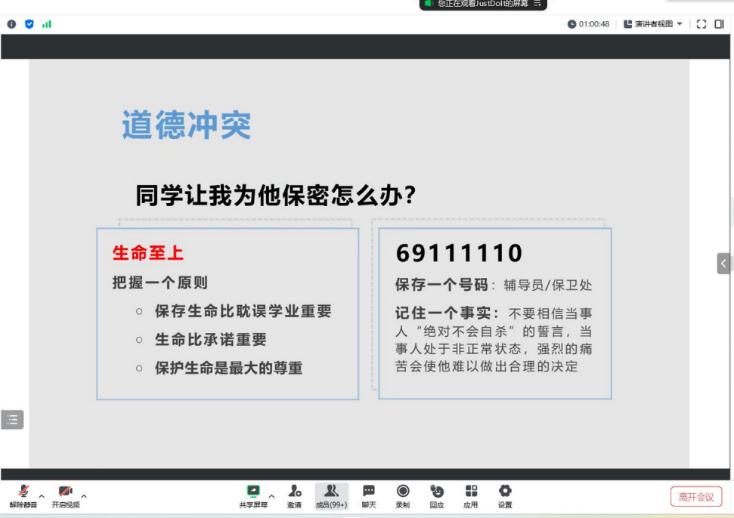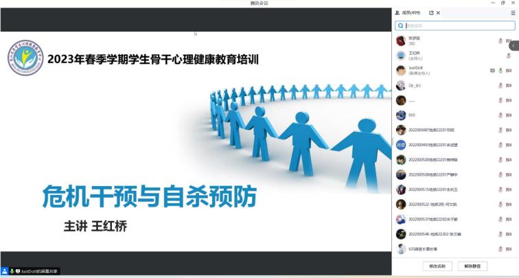 (通讯员 张梦琪)公司于2023年6月30日通过腾讯会议的方式举行以“危机干预与自杀预防”为主题的心理讲座。各年级班长、团支书、安全员、心理委员、寝室长及暑期留校员工等共计499名师生参与学习交流,心理专干王红桥老师主讲。