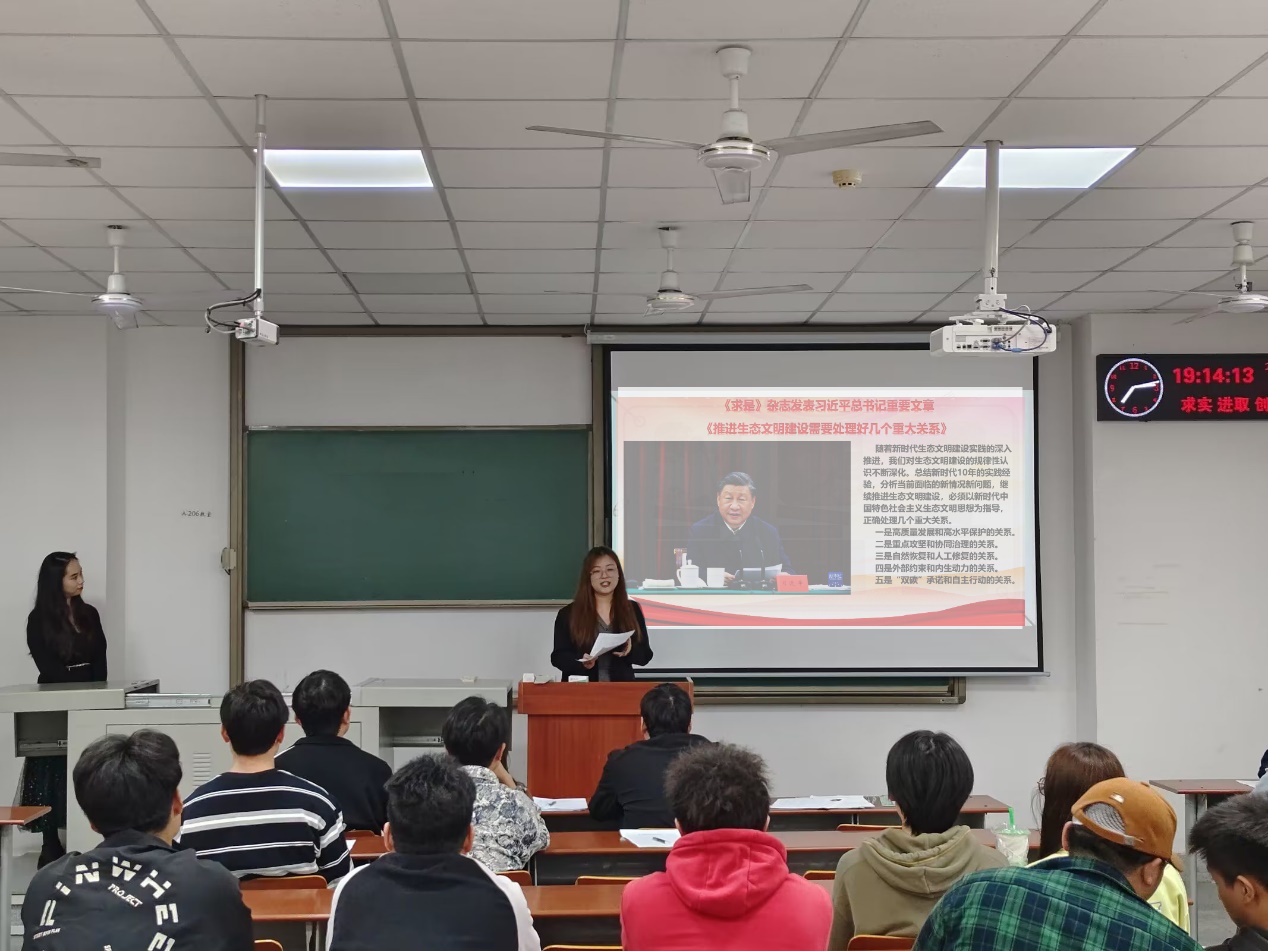 随后,付安琪同学在发言中提到,作为新一代青年,我们应坚决拥护党的领导,不断深化对生态文明建设的规律性认识,以新时代中国特色社会主义生态文明思想为指导,持续推进生态文明建设。正确处理高质量发展和高水平保护、重点攻坚和协同治理、自然恢复和人工恢复、外部约束和内生动力、“双碳”承诺和自主行动五个方面的关系,使新时代中国以更加积极的姿态参与全球气候治理,形成更加有利的新局面。
