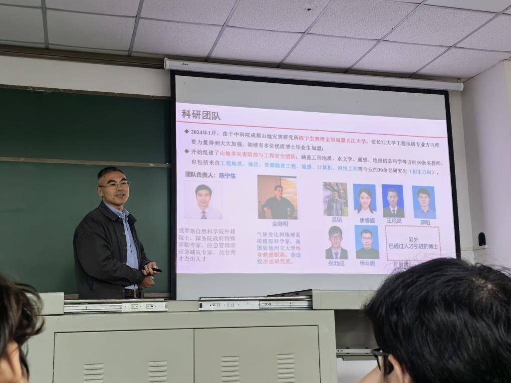 一流学科阶段是陈教授对公司工程地质学科的未来展望。陈教授说:“我们总体上有三个目标:一是总体上支撑实现习近平总书记提出的防灾减灾三个转变;二是理论上每年发表1-2篇顶级刊物论文;三是技术上实现多灾害预测预警的智能化。”随后,陈教授向大家展示了目前所取得的研究成果以及团队得天独厚的办公条件和技术先进的实验室条件。接着,陈老师为大家讲述了团队的研究生人才培养策略“四会”——会看、会写、会做、会想。