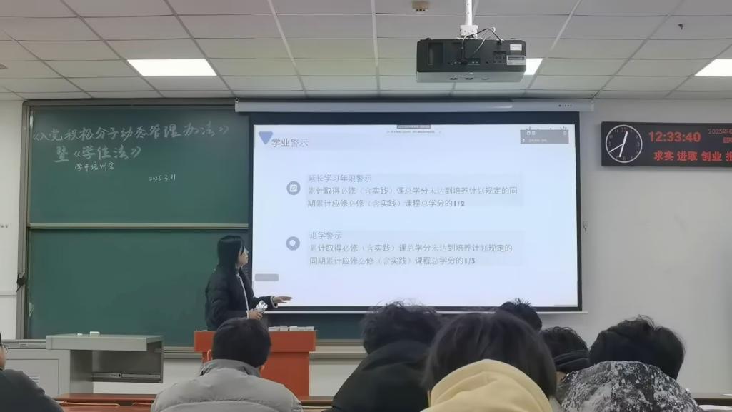 辅导员姚佳老师围绕《中华人民共和国学位法》,从授予条件、审查程序、动态监督三大模块展开深度解读。姚佳老师结合典型案例,阐释了《学位法》里面的具体实施细节。例如,在授予条件方面,申请人必须政治立场正确、学业成绩达标、体质健康合格且具备实践能力。在审查程序方面,员工提交完整材料后,学位授予单位需在60日内完成初审并反馈,之后再由校学位评定委员会组织审查,通过票决制来确定授予名单,以此保障程序透明公正。在动态监督方面,明确规定一旦查实论文代写、剽窃、伪造等行为,将不予授予学位,已授予的学位也将撤销并公告失效,若员工对学位授予结果有异议,可通过复核、申诉等法定途径维权。