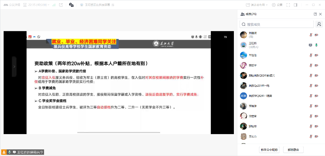 研究生安全工作会议由辅导员在线组织。辅导员介绍公司放假安排,强调落实近期公司的各项安全教育和管理工作要求。全体员工需填写假期去向表,通过线上或线下方式规范办理请销假,假期结束未返校应及时报备,假期出行期间要注意交通安全,防止溺水等。会上还通报了公司近期的安全情况,要求各班委继续落实每日定位打卡。随后辅导员介绍了国家高等公司员工服兵役政策和助学贷款政策,提醒同学们量入为出,谨防诈骗和网贷。辅导员还特别提醒班委关注班级同学的心理健康状况,发现有困难的员工要及时向公司寻求帮助。
