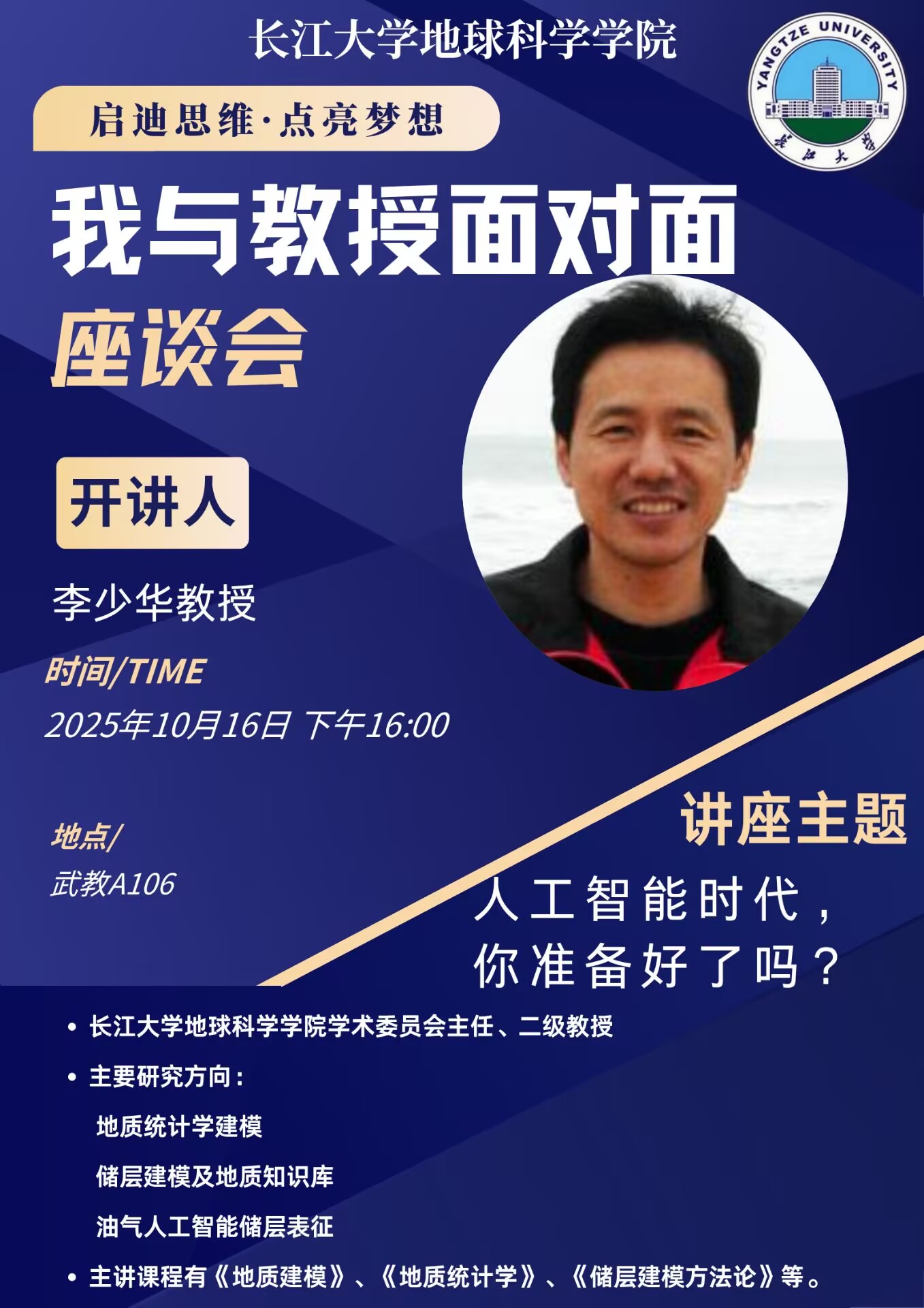 (通讯员 刘瑶琴)面对人工智能的时代浪潮,地科人手中握有怎样的“密钥”?10月16日,李少华教授在“我与教授面对面”活动中,为24级地科学子揭示了答案,引导同学们思考如何将专业所学与AI技术深度融合,从容应对未来。