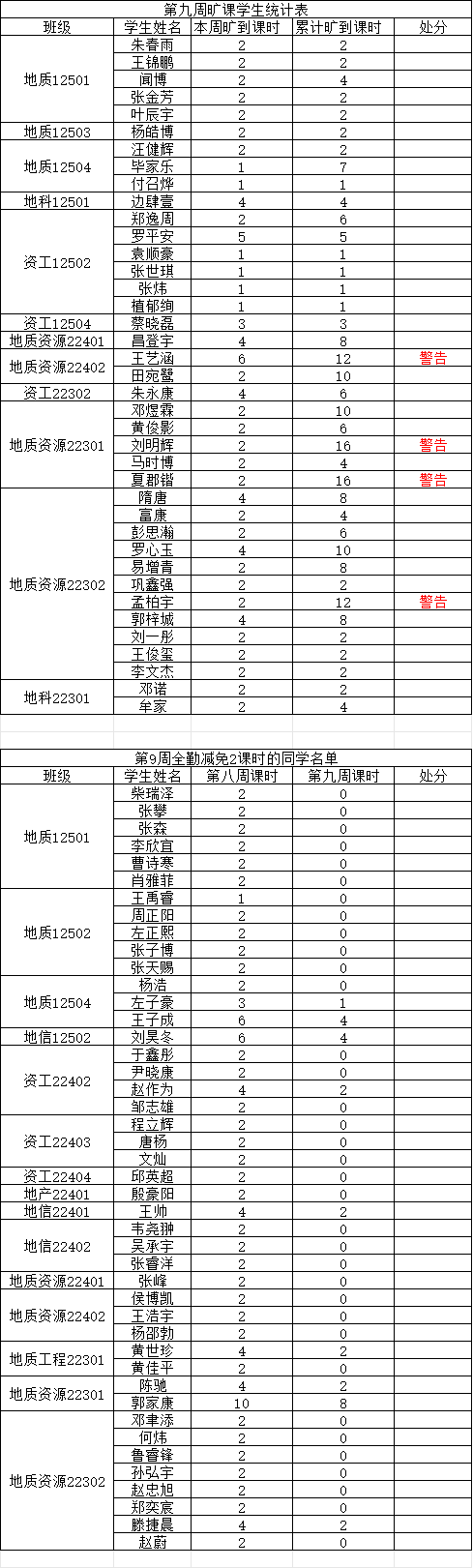 关于第九周课堂考勤的通报 为落实公司关于加强学风建设的相关要求,进一步规范课堂秩序,营造良好的学习氛围,公司持续开展常态化课堂考勤工作。现将第九周考勤情况通报如下: 一、旷课员工名单 二、相关说明 依据《积极分子动态管理办法》第五章,积极分子考察期内无故旷课取消身份。 依据《BEVITOR伟德员工违纪处分办法》,一学期累计旷课达到规定学时的,分别给予以下处分: 1. 旷课达到12学时,给予警告处分; 2. 旷课达到24学时,给予严重警告处分; 3. 旷课达到36学时,给予留校察看处分; 4. 旷课达到48学时,给予留校察看处分; 5. 旷课达到60学时,给予开除学籍处分。 注:若员工某周存在旷课记录,但次周所有课程均正常到课(无迟到、旷课),则可从该生累计旷课课时中减免 2学时。