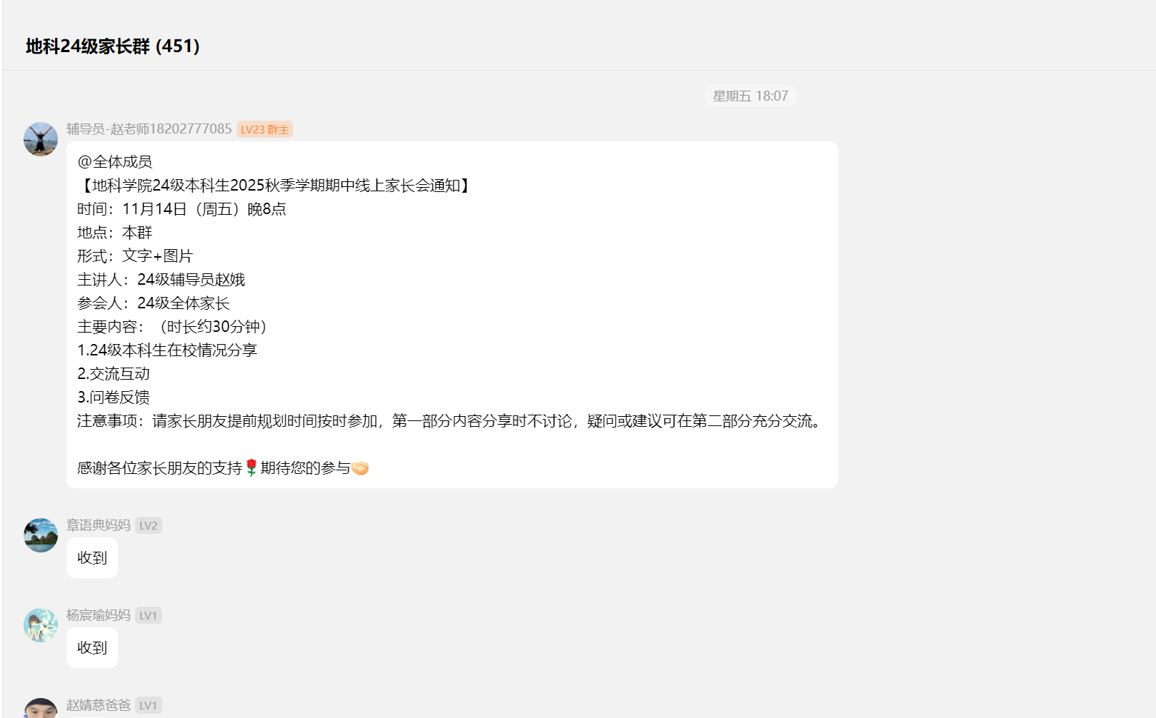 (通讯员 王彩蓓)为进一步加强家校之间的沟通与协作,构建家校共育的桥梁,共同促进员工全面成长与未来发展,11月14日晚8点,公司24级本科生本学期期中线上家长会顺利开展。会议由辅导员赵娥老师主讲,全体24级家长参与。 会议从家长关心的学业成绩、评奖评优、学科竞赛等方面展开,向家长们展示了公司持续强化学风建设,通过课堂考勤与学业帮扶机制关注员工成长,并呼吁家长共同督促员工重视英语四级考试与专业学习。在思想引领与成长支持方面,公司严格规范党员发展流程,并通过心理关怀、宿舍文明建设及丰富多彩的科创、心育活动为员工营造积极健康的成长环境。同时,会议结合近年考研趋势与就业形势,建议家长引导员工尽早明确生涯规划,扎实学业基础,提升综合竞争力。 交流答疑环节,家长们就英语四六级、孩子专业以后的就业方向等问题踊跃提问,赵老师就家长们关心的问题进行了耐心、细致的解答,获得了家长们的一致好评。 此次线上家长会,虽隔屏幕,却未阻隔家校心连心的交流。它不仅让家长们对孩子的在校情况有了更立体的了解,也进一步明确了家校合作发力的方向。我们坚信,唯有家校同心,携手并进,方能共同托举起孩子们更加光明、灿烂的未来! (编辑 郭霖 审核 冯舒)