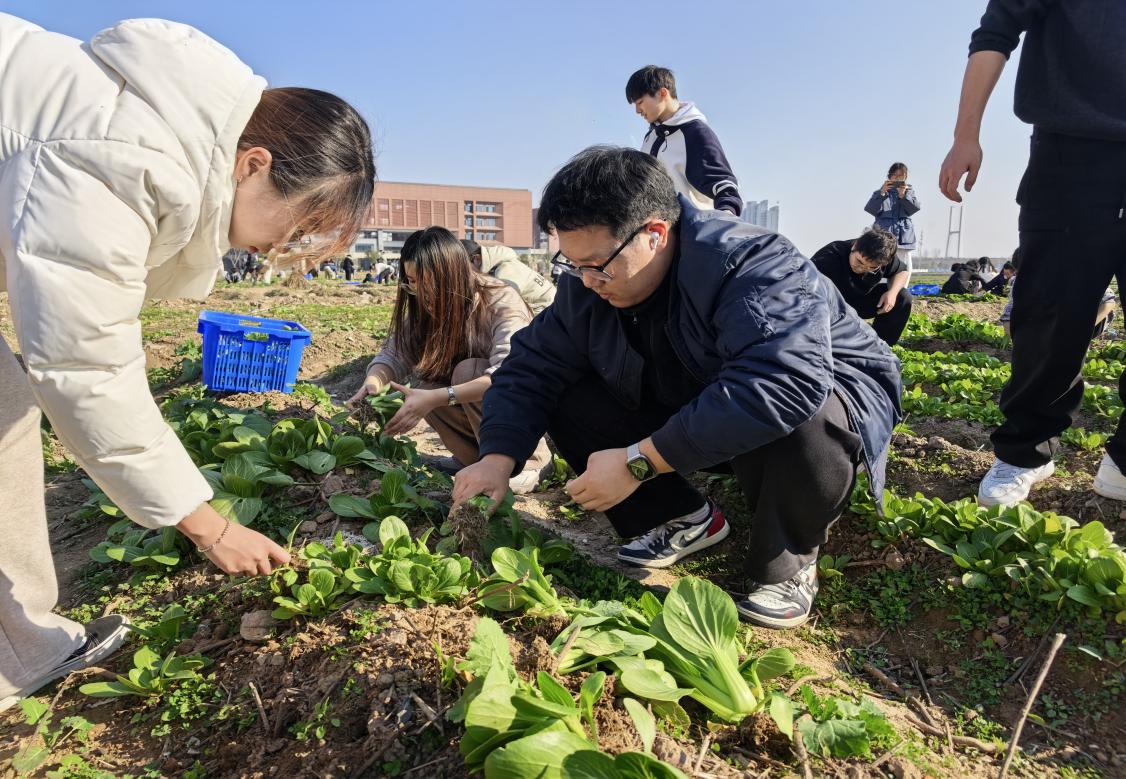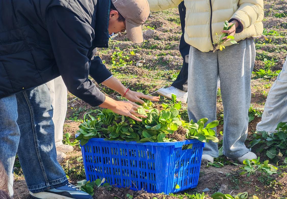 活动中,员工们分工明确、配合默契,共同完成了责任田内上海青、生菜等当季作物的采收、分拣、清理及搬运工作。尽管天气寒冷,同学们依然热情高涨,劳动场面井然有序。大家一边劳作,一边围绕作物生长特性、种植技术和专业学习心得展开交流,在实践与对话中深化了对农业生产和劳动价值的理解。